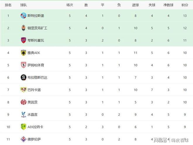 5輪過(guò)后,來(lái)自法甲的斯特拉斯堡有13分,提前一輪鎖定前八名的資格,這支被譽(yù)為切爾西二隊(duì)的球隊(duì),幾周前擊敗水晶宮,被視為冠軍的熱門之一。德甲的美因茨排在第8名,末輪跟第5名,積分相同的薩姆松體育相遇,兩隊(duì)也許只能產(chǎn)生一個(gè)直通名額。同樣有10分,來(lái)自西甲的巴列卡諾,末輪面對(duì)實(shí)力不強(qiáng)的德利塔,只要全取三分必定晉級(jí)16強(qiáng)。